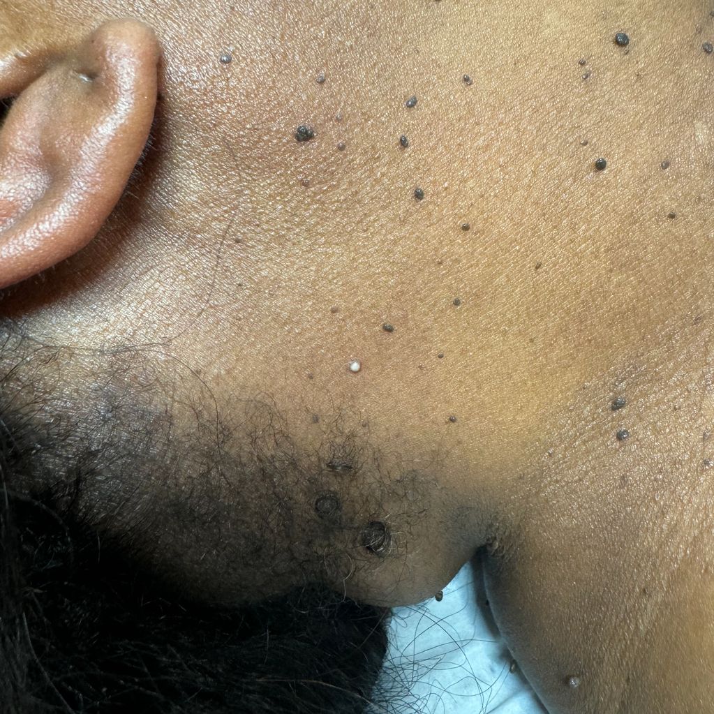 usually multiple 1-5 mm diameter, smooth, firm, black or darkbrown papules on the face or neck.